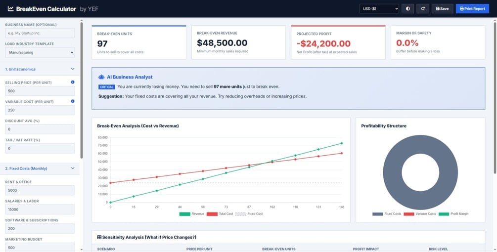 The BreakEven Calculator by YEF is a modern, easy to use web tool that helps you understand exactly how many units you must sell, how much revenue you need, and how safe your business really is every month.